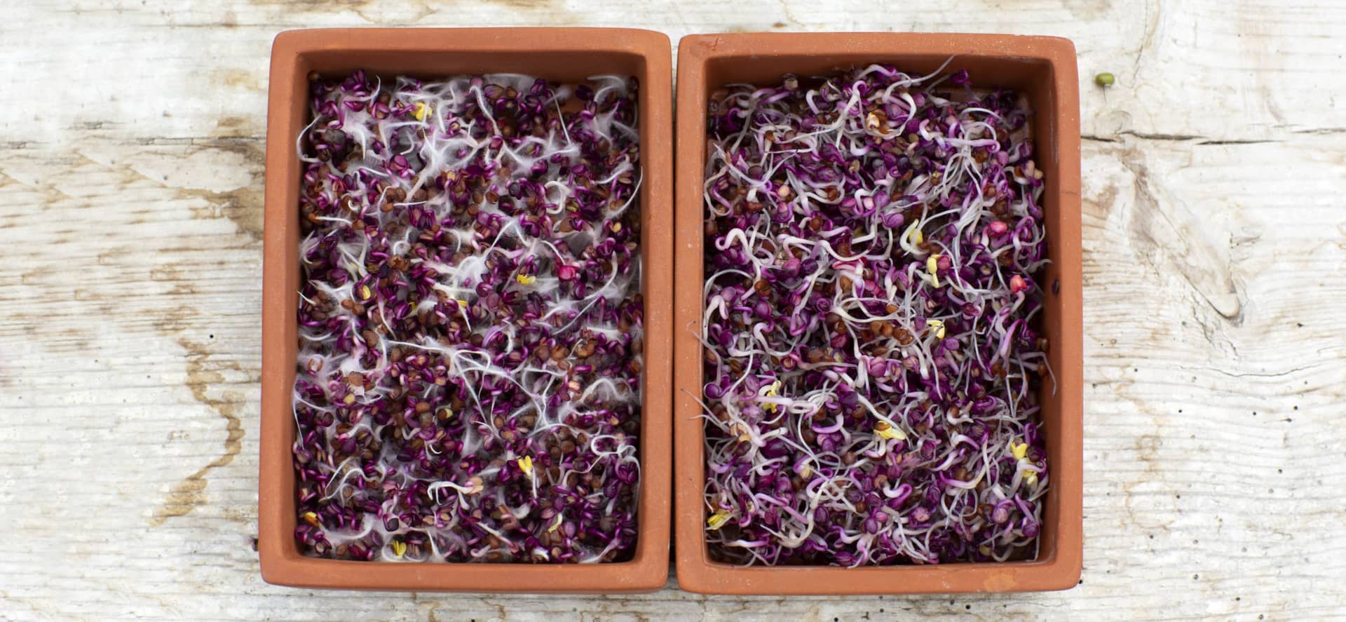 På bilderna nedan ser du rädisgroddar med mycket rotludd till vänster och utan rotludd till höger. Rotludd är INTE ett tecken på dåliga groddar, utan snarare tvärt om. Ett tecken på groddar med friska svansar som gör sitt jobb! Rädis-, broccoli-, grönkåls- och rapsgroddar får ofta fibriller.