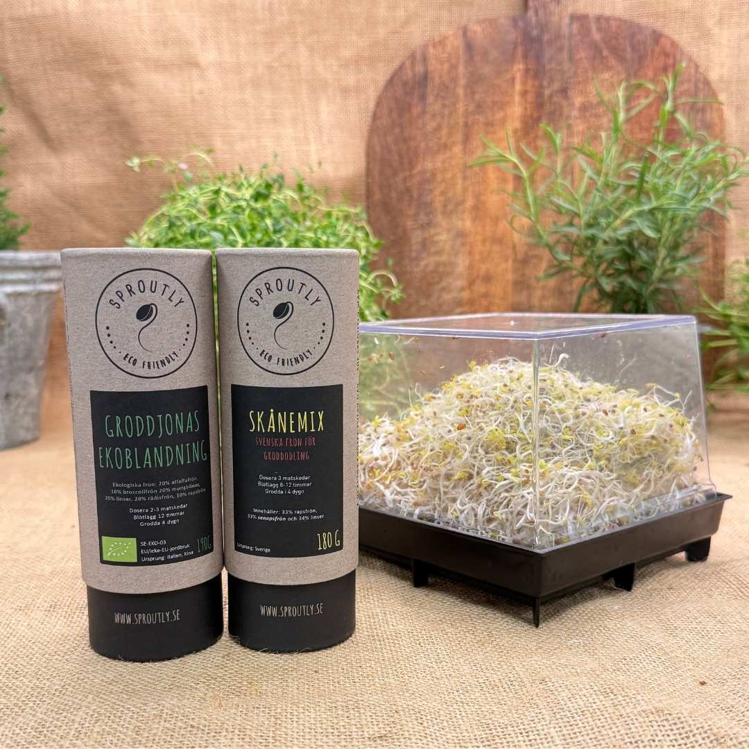 Paketet innehåller en groddbox och två frösorter för groddning